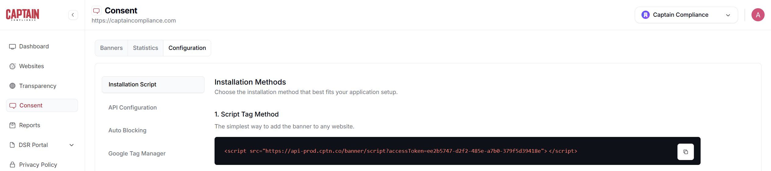 Captain Compliance is published by installing a domain-specific script on your website. Each domain has its own unique script, and the correct script must be used for the site where the consent banner will appear.